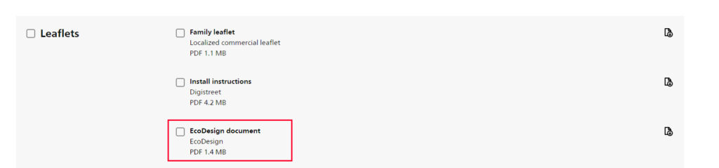 Select the EcoDesign document under the product family section you are looking for.